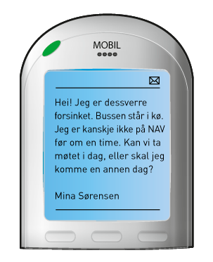 Mina er arbeidsledig og har registrert seg på NAV. I dag har hun en avtale med en NAV-konsulent. Hun tar bussen til NAV, men bussen blir forsinket på grunn av kø. Hun skriver en tekstmelding til konsulenten.