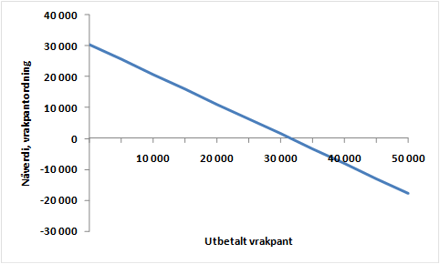 Figuren antyder at ved en utbetalt vrakpant på 40 000 er nåverdien av ordningen for bileier positiv dersom den vrakpanten som ble innbetalt seks år tidligere, ikke overstiger ca. 32 000 kroner. Nåverdien er ca. 30 000 dersom ordningen kun innebærer utbetaling av 40 000 etter seks år.
