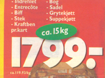 I denne annonsen divideres et sikkert tall (1 799 kroner) med et usikkert tall (ca. 15 kilo). Siden butikken i slike tilfeller er pålagt å vise kiloprisen, er denne beregnet til 119,93 kroner. En komisk påminnelse om sikkerhetsillusjonen blir det når «ca.» settes foran denne prisen.